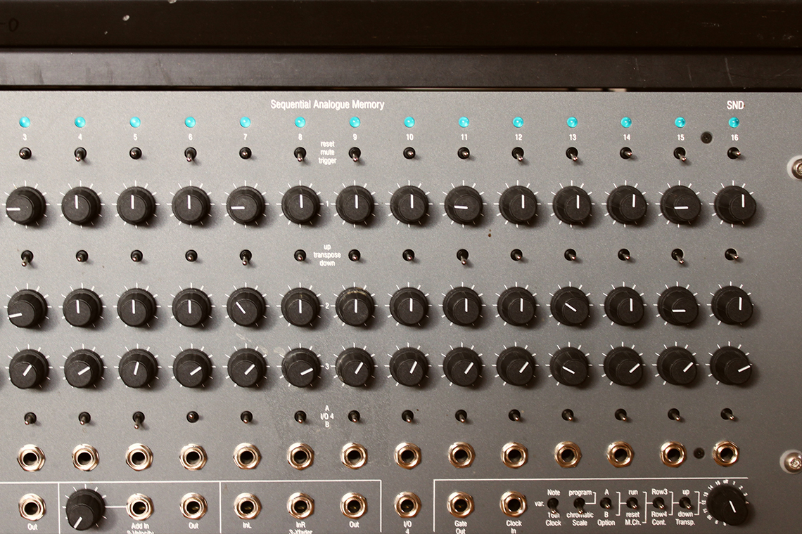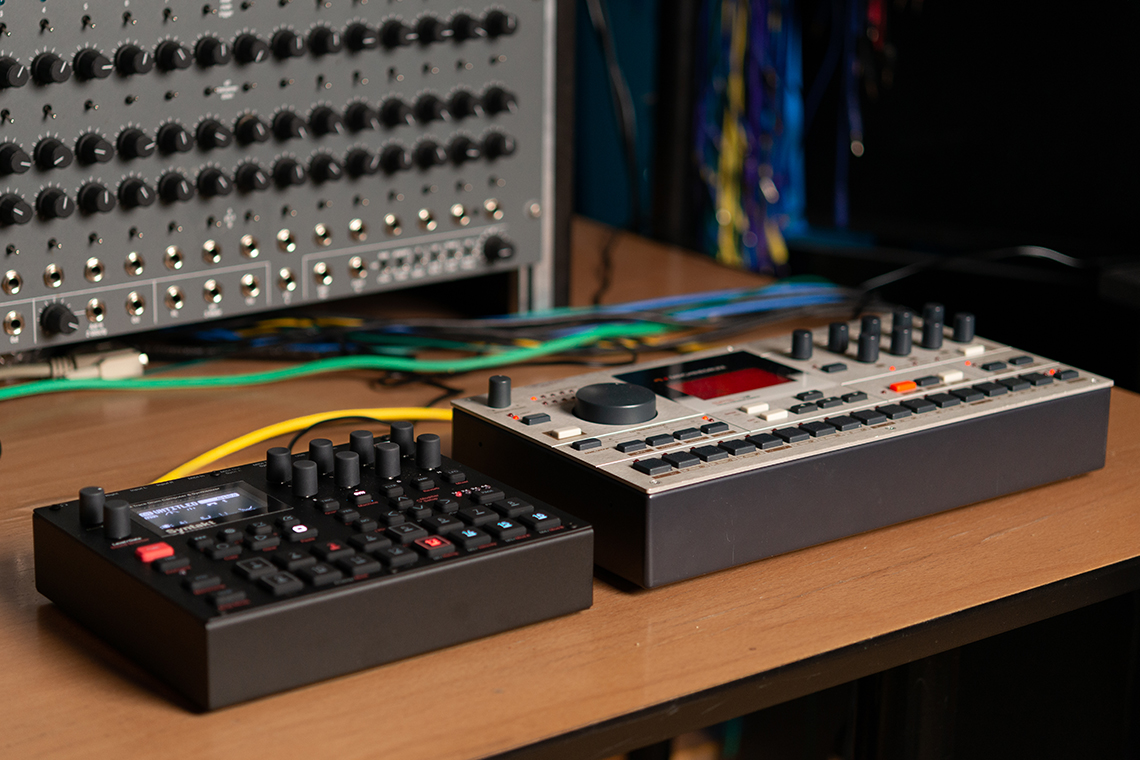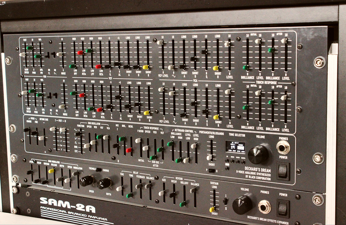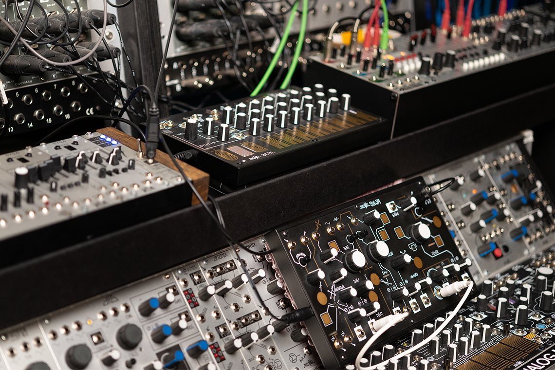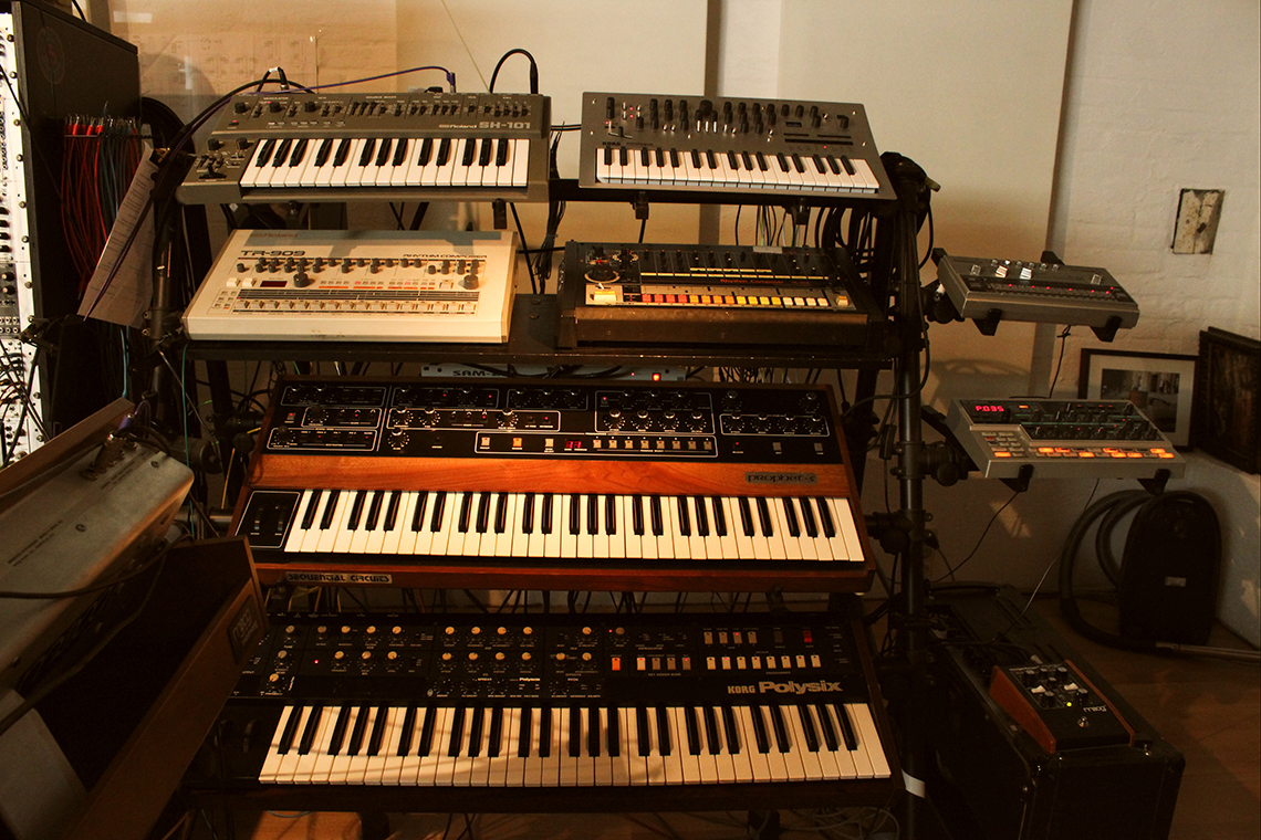 Black Cooperatin Deckards Dream (with Expander), Roland Jupiter 8, Roland SH 101, Roland XV-5080, Roland Juno 60, Roland TB-303, Roland TB 303, Devil Fish, Roland TR 808, Roland TR-909, Roland TR 606, Roland S-55, Jomox 888, Korg Polysix (with all 3 Tubbutec modifications), Korg Minilogue